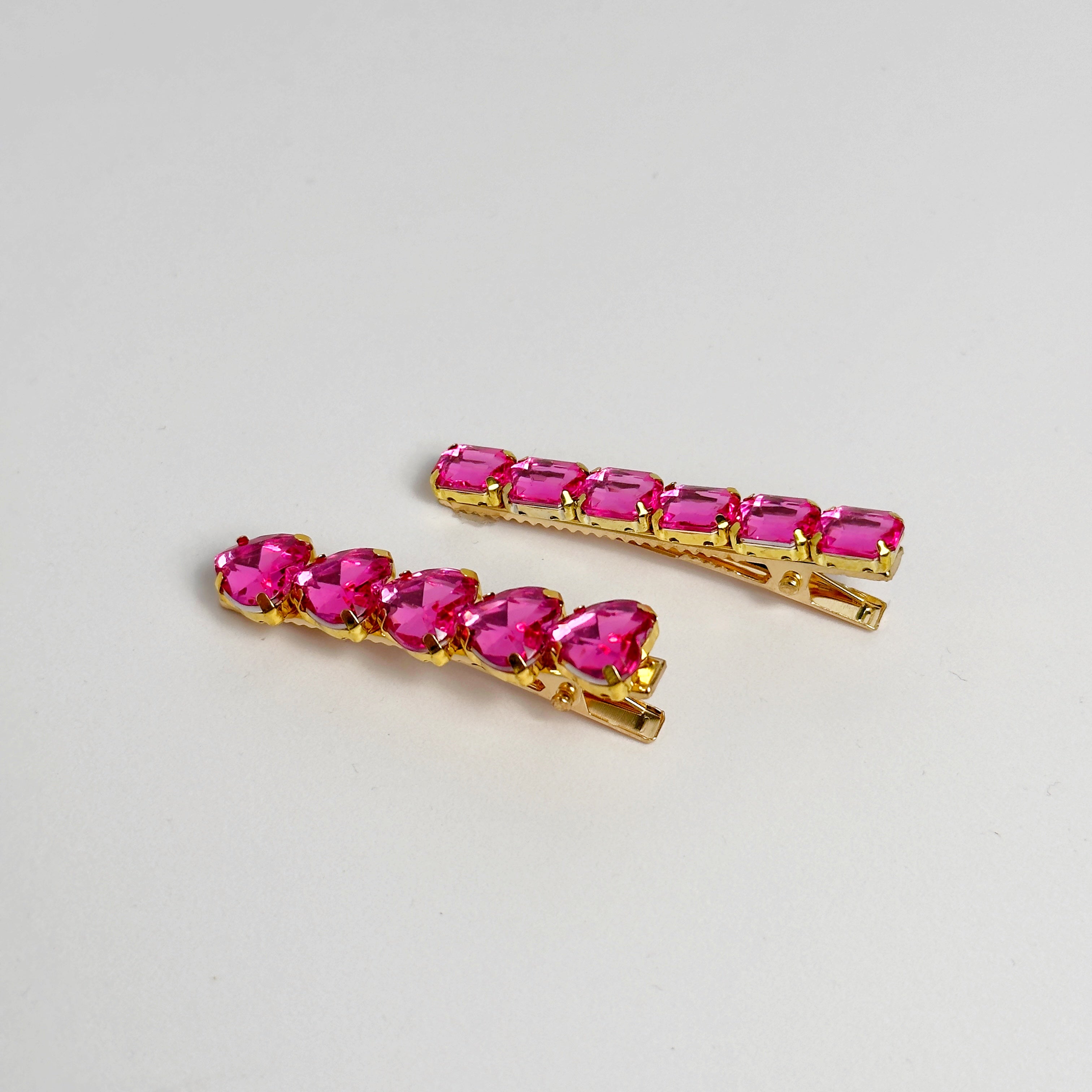 Elevate your hairstyle with our Blush Gemstone Hair Clip Set. This enchanting duo features one clip adorned with glamorous stones, adding a touch of glamour to any look.