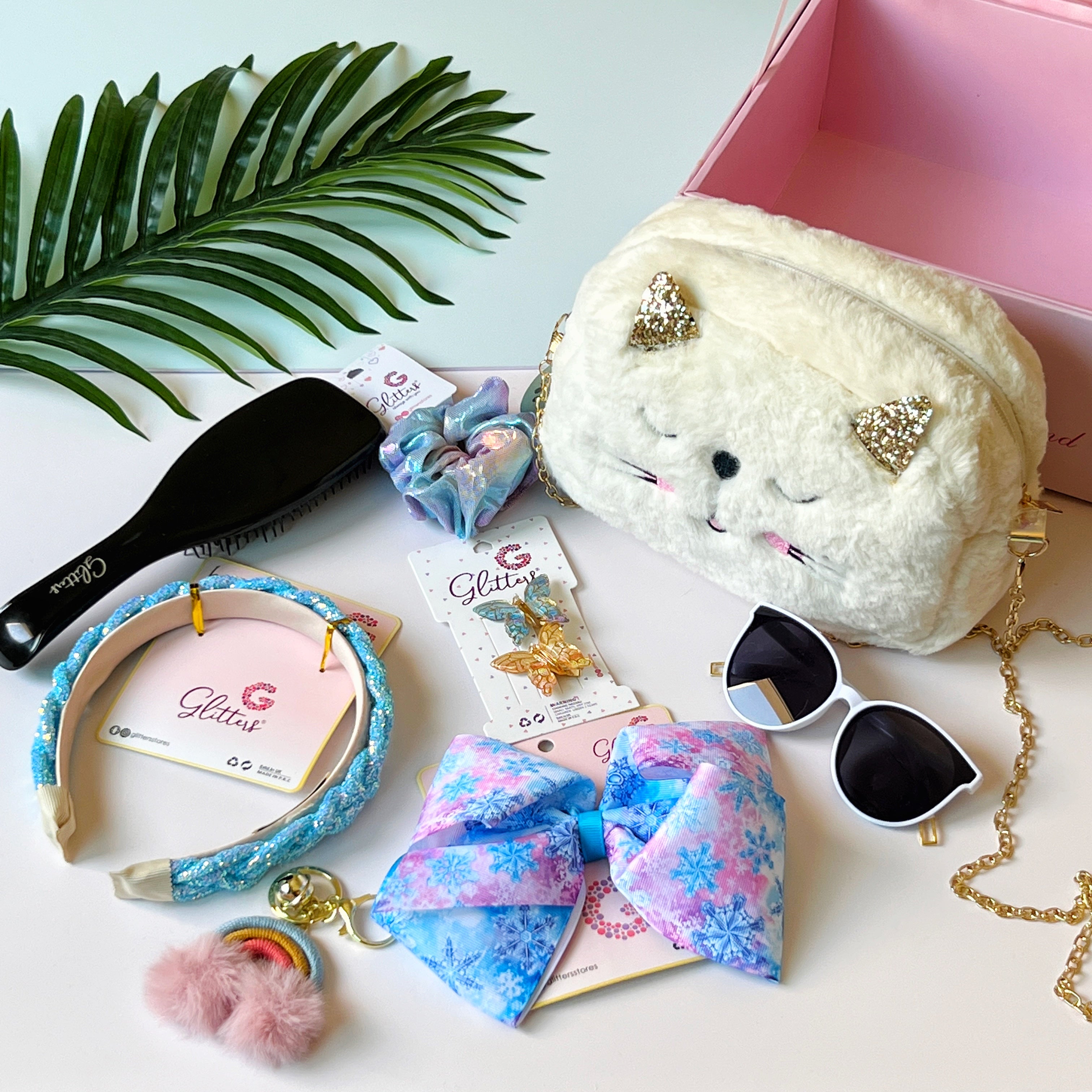 Sparkle and shine with this bold and beautiful set of accessories, featuring a blue braided glitter hairband, cat white crossbody furry bag, sun white glasses, jumbo shiny blue Scrunchie, rainbow keychain, glittery glass butterfly clips, black detangling brush, and blue ice design big bow clip. Make a statement with every look!