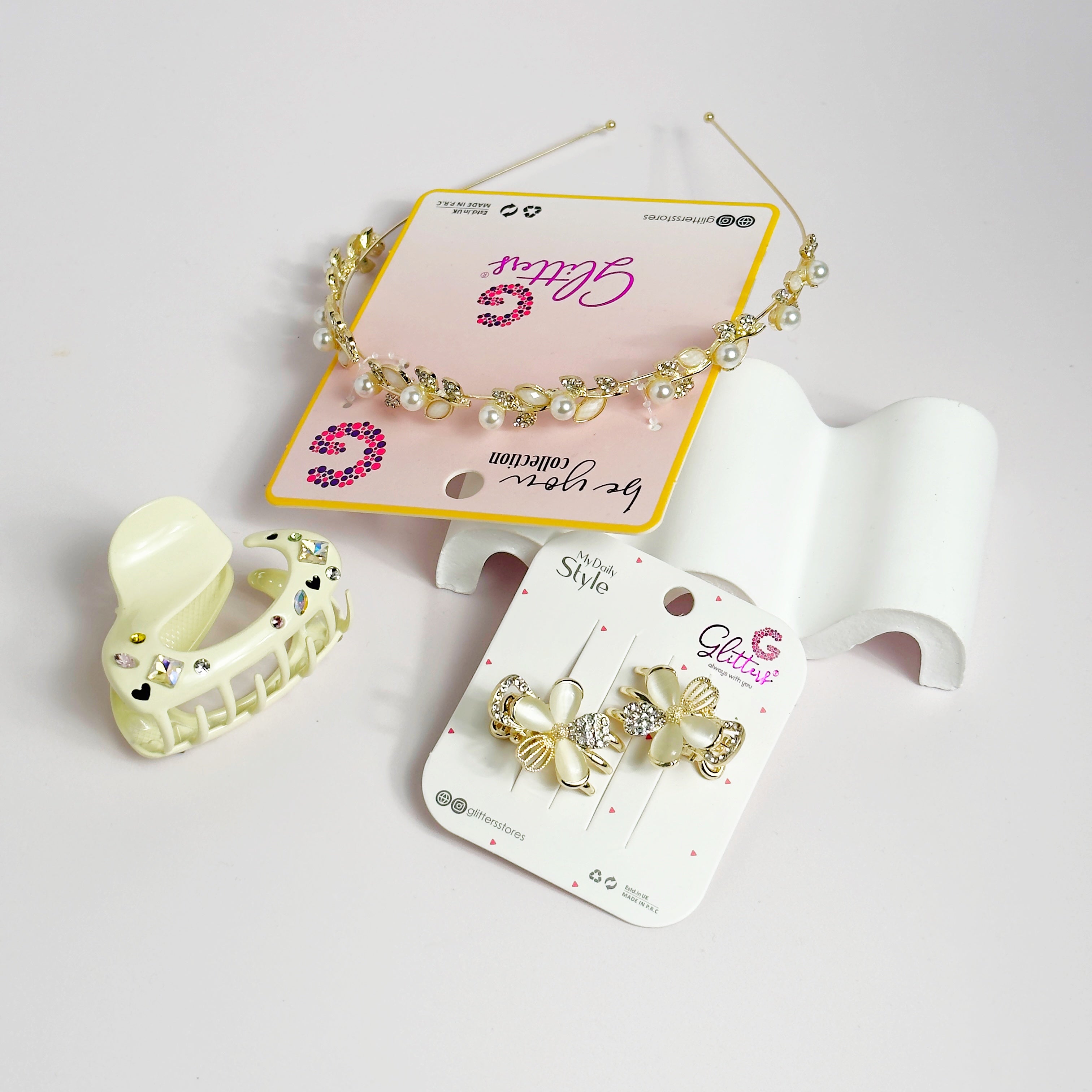 Complete your look with our Glamorous Gemstone Trio Hair Accessories Set. This enchanting combo includes the regal Gemstone Majesty Claw Clip for strong and stylish hold, the delicate Floral Gem Pearl Claw Clip for whimsical elegance, and the sophisticated Pearl Leaf Elegance Hairband adorned with pearls and metal leaves. Elevate your hairstyle effortlessly with this trio, perfect for adding a touch of glamour to any occasion.