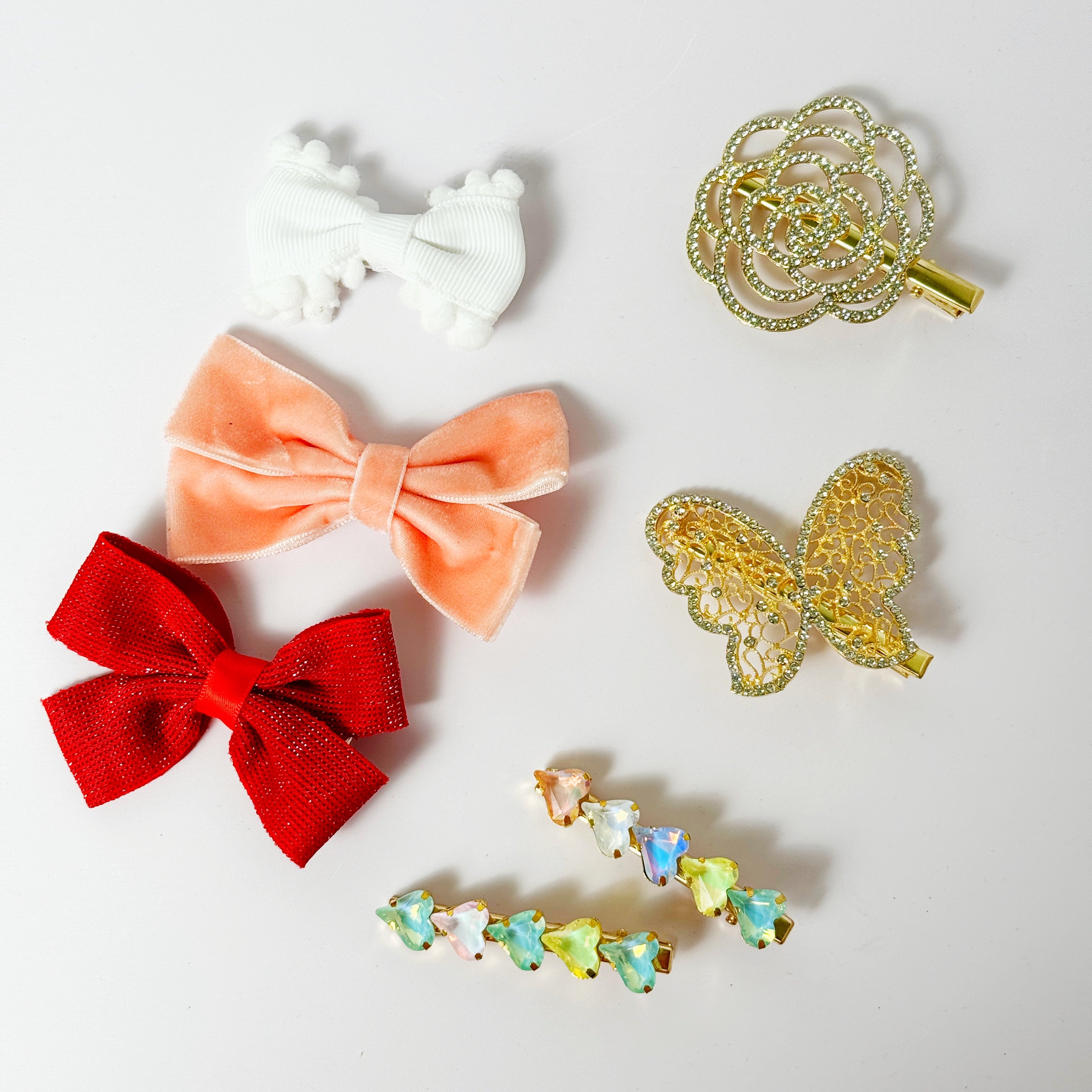 Embrace a world of elegance and whimsy with our Enchanted Hair Accessory Set. This curated collection features the Textured Trio Bow Clips, a radiant Rose-Shaped Jeweled Hairclip, a dazzling Butterfly-Shaped Jeweled Hairclip, and a pair of Colorful Heart-Shaped Clips. Each piece is thoughtfully designed to add a touch of magic and sophistication to your hair