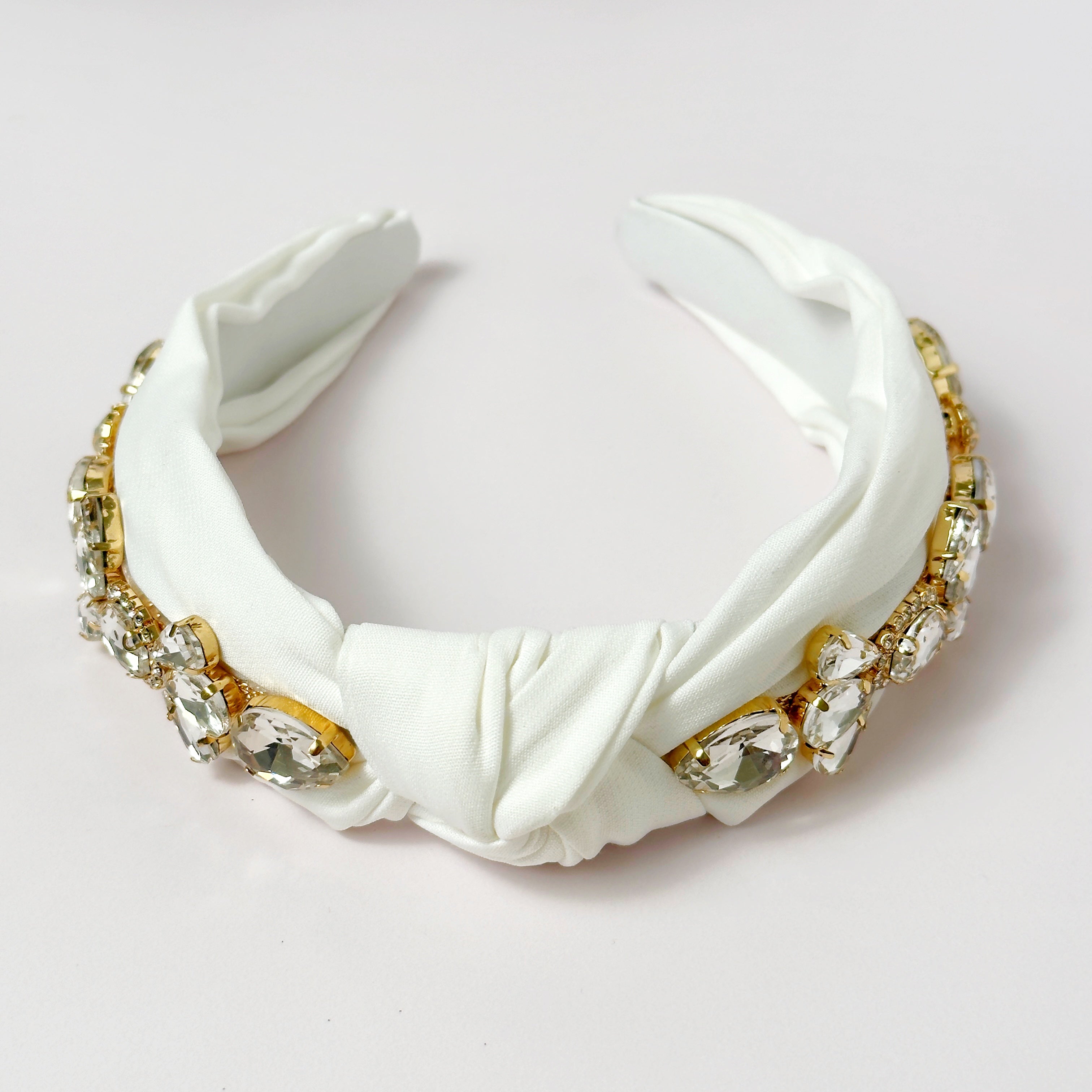 Add a touch of elegance to your hairstyle with our Jeweled Knot Hairband. Crafted in white with sparkling jewels adorning the knot, this accessory effortlessly elevates any look with its timeless charm and sophistication. Perfect for adding a touch of glamour to your ensemble.