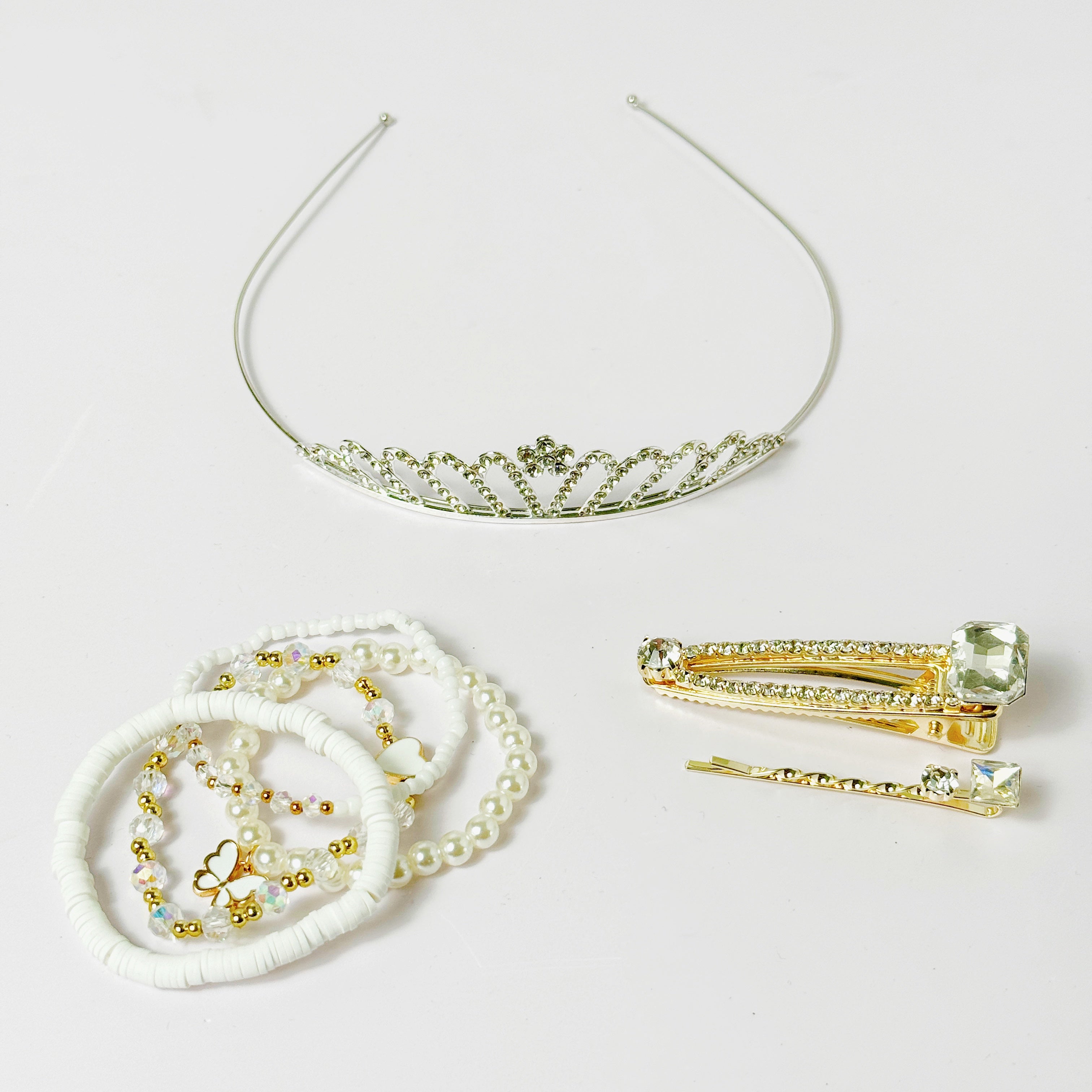 Introducing our Elegance Set: a Jeweled Hairband Tiara, Diamond Hairclip, and 4-Piece White Bracelet Set. Perfect for adding a touch of glamour to any occasion, this collection combines sparkle with sophistication to beautifully accentuate your style