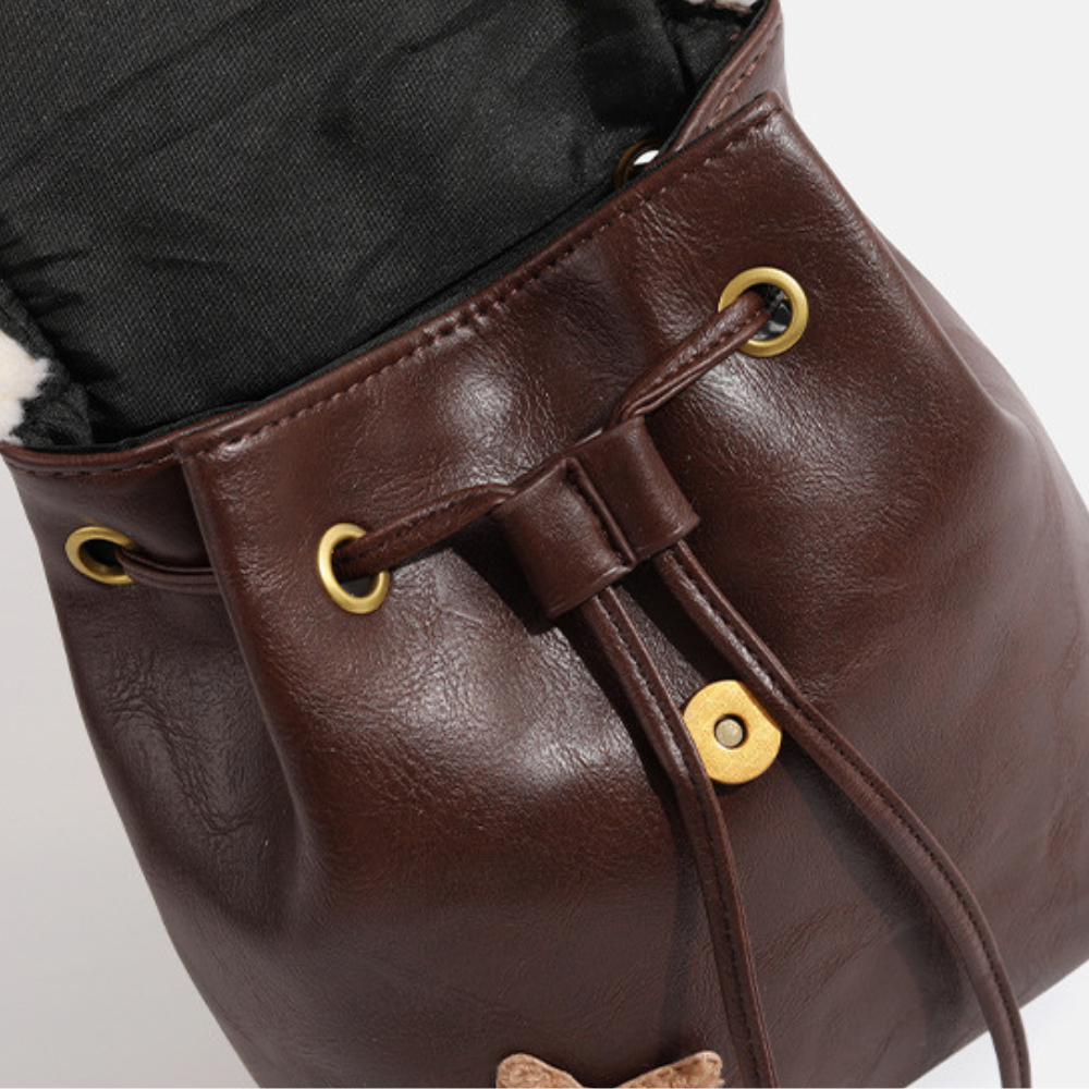 Get ready to channel some serious vintage vibes with our charming mini backpack! Made with premium brown leather, it features a cute plush bear detail and star appliques with cosy sherpa trim. Perfect for casual outings and shopping trips, this compact backpack offers practical storage for your daily essentials. Plus, its adjustable shoulder straps ensure a comfortable and stylish fit. Measures approximately 20cm in height and 15cm in width. Who says functional can't be fun?