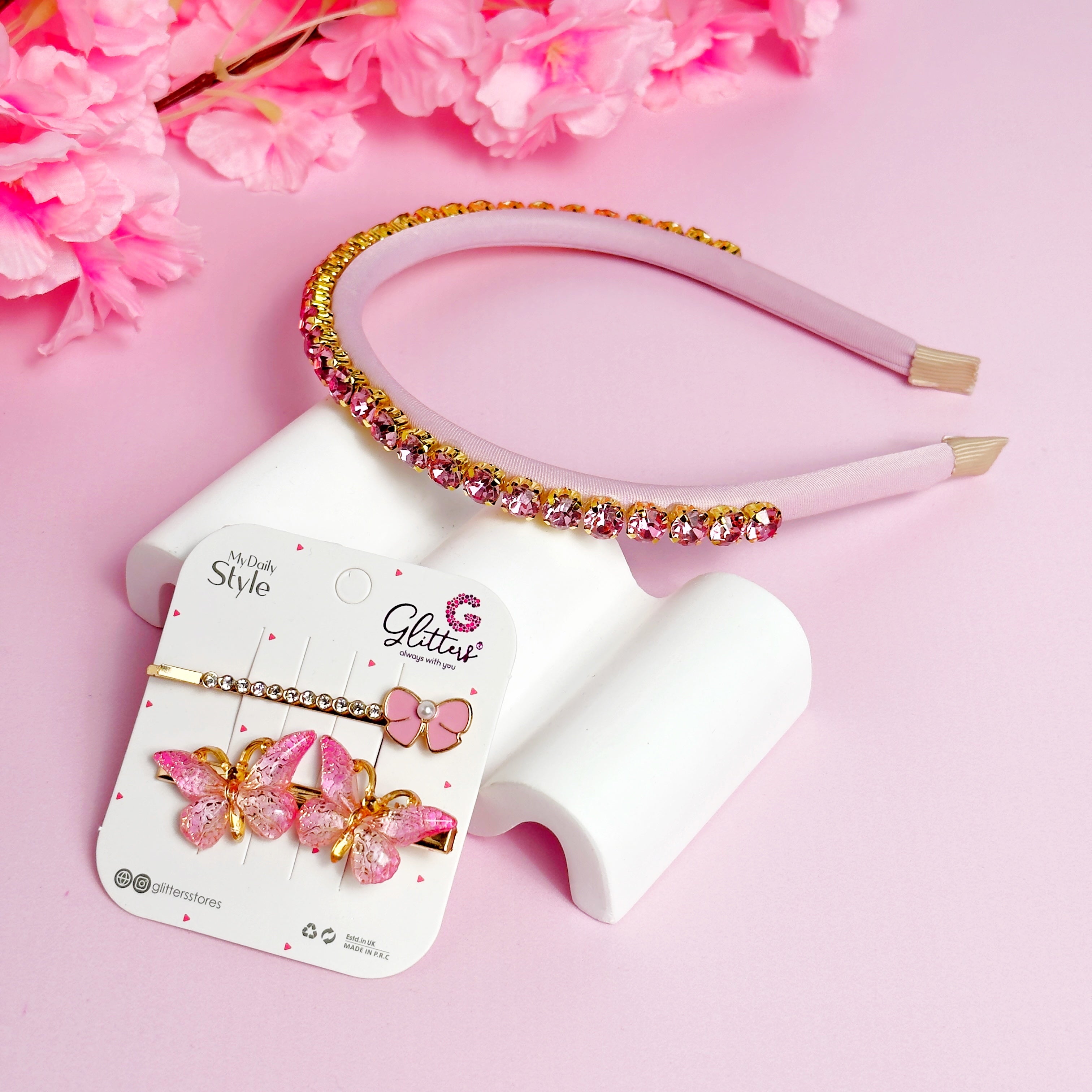 Elevate your hairstyle with our Pink Flutter Duo Hair Accessories Set. This delightful ensemble features a charming pink bow hairpin and a graceful butterfly-shaped hair clip.