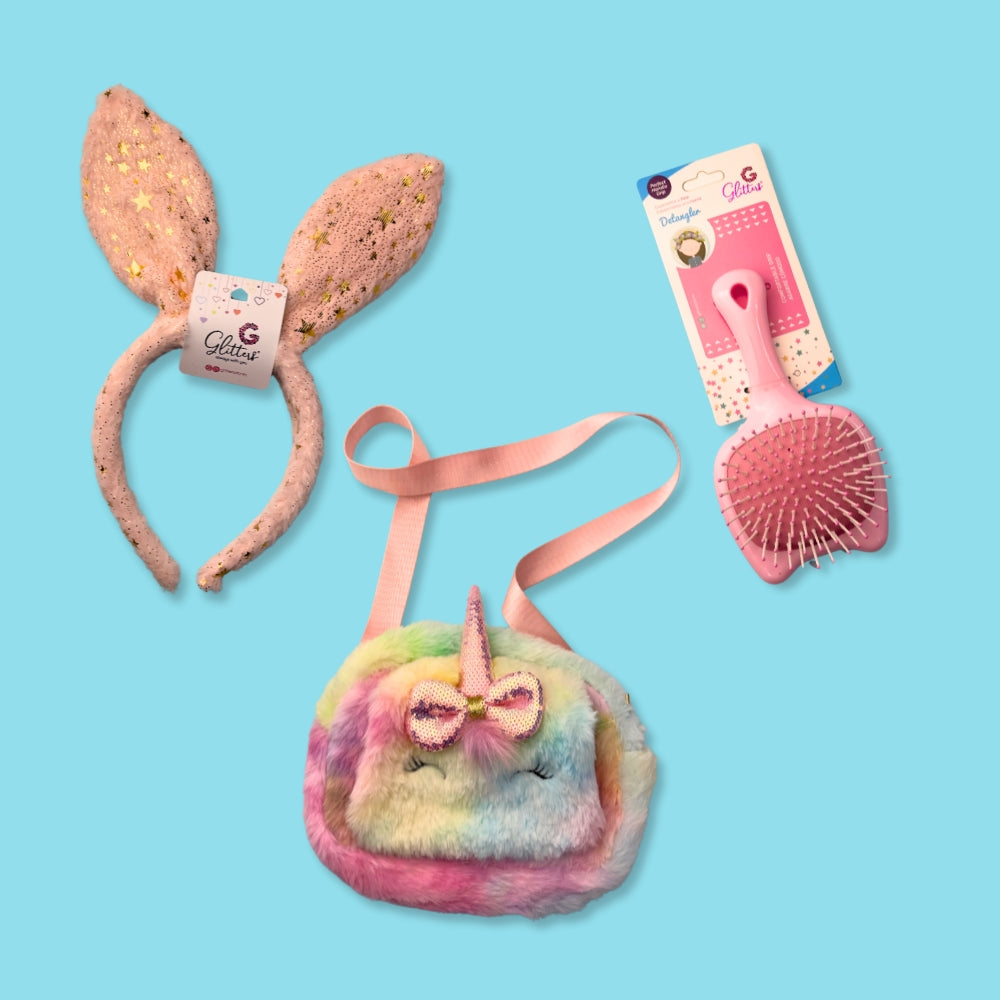Step into a world of magic with the Glitters Fantasy Dream Accessories Set! This adorable collection is perfect for little fashionistas who love all things sparkly and fun. Featuring a plush unicorn crossbody bag, a glittery bunny ear headband, and a cute detangling hairbrush, this set adds a whimsical charm to any outfit. Whether for daily wear, playdates, or special occasions, these accessories bring a touch of fantasy to your little one's style.