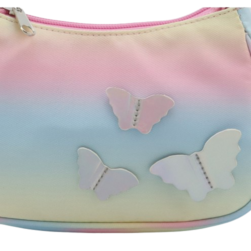 Embrace whimsy with our Butterfly Rainbow Gradient Handbag. This vibrant accessory features a captivating rainbow gradient design adorned with delicate butterfly motifs, adding a touch of playful charm to your ensemble. Carry your essentials in style while radiating joy and positivity wherever you go with this eye-catching handbag.